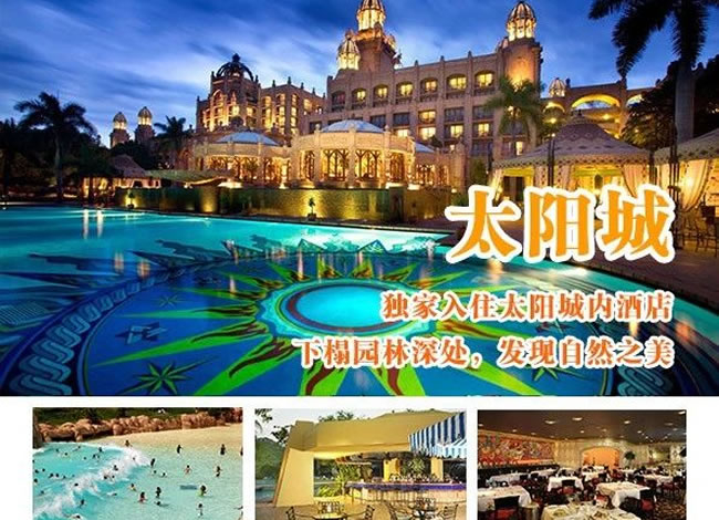 酒店早餐。前往機(jī)場(chǎng),搭乘航班飛往約堡。驅(qū)車(chē)前往南半球最大的娛樂(lè)中心-太陽(yáng)城。不曾身臨其境,便無(wú)法真正理解太陽(yáng)城給人所帶來(lái)的震撼。將古老傳說(shuō)的神秘滄桑、非洲大陸的野性粗獷和現(xiàn)代生活的便利舒適那樣完美地融合在一起。你可以在失落城探尋非洲大陸上最古老的秘密,根據(jù)神話傳說(shuō)興建的地震橋以及豪華賭場(chǎng)、著名的建筑-失落城等。這里有清幽的湖光山色,無(wú)數(shù)的珍禽異草,游人可漫步其中享受。(含自由活動(dòng)游覽時(shí)間約3小時(shí)) 晚餐后,入住太陽(yáng)城內(nèi)豪華酒店,您可于太陽(yáng)城內(nèi)賭場(chǎng)大顯身手。溫馨提示:約堡-太陽(yáng)城,約210公里,車(chē)程約3小時(shí)