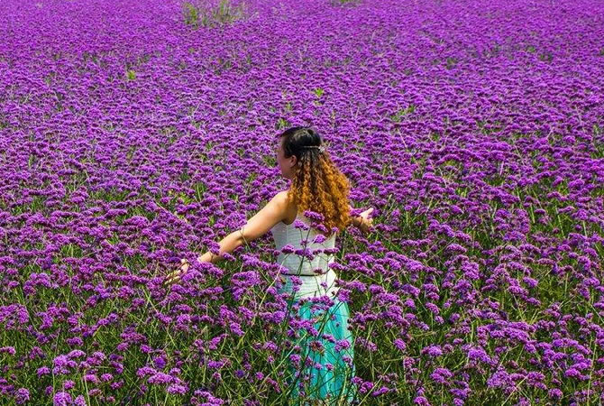 馬鞭花景區(qū),近百畝馬鞭草花田里,鮮花盛開(kāi)。遠(yuǎn)遠(yuǎn)望去,如同為綠色大地鋪上一層紫色的地毯。微風(fēng)拂動(dòng)下,紫色的馬鞭草愈發(fā)動(dòng)人,吸引了不少游客前來(lái)拍照留影。